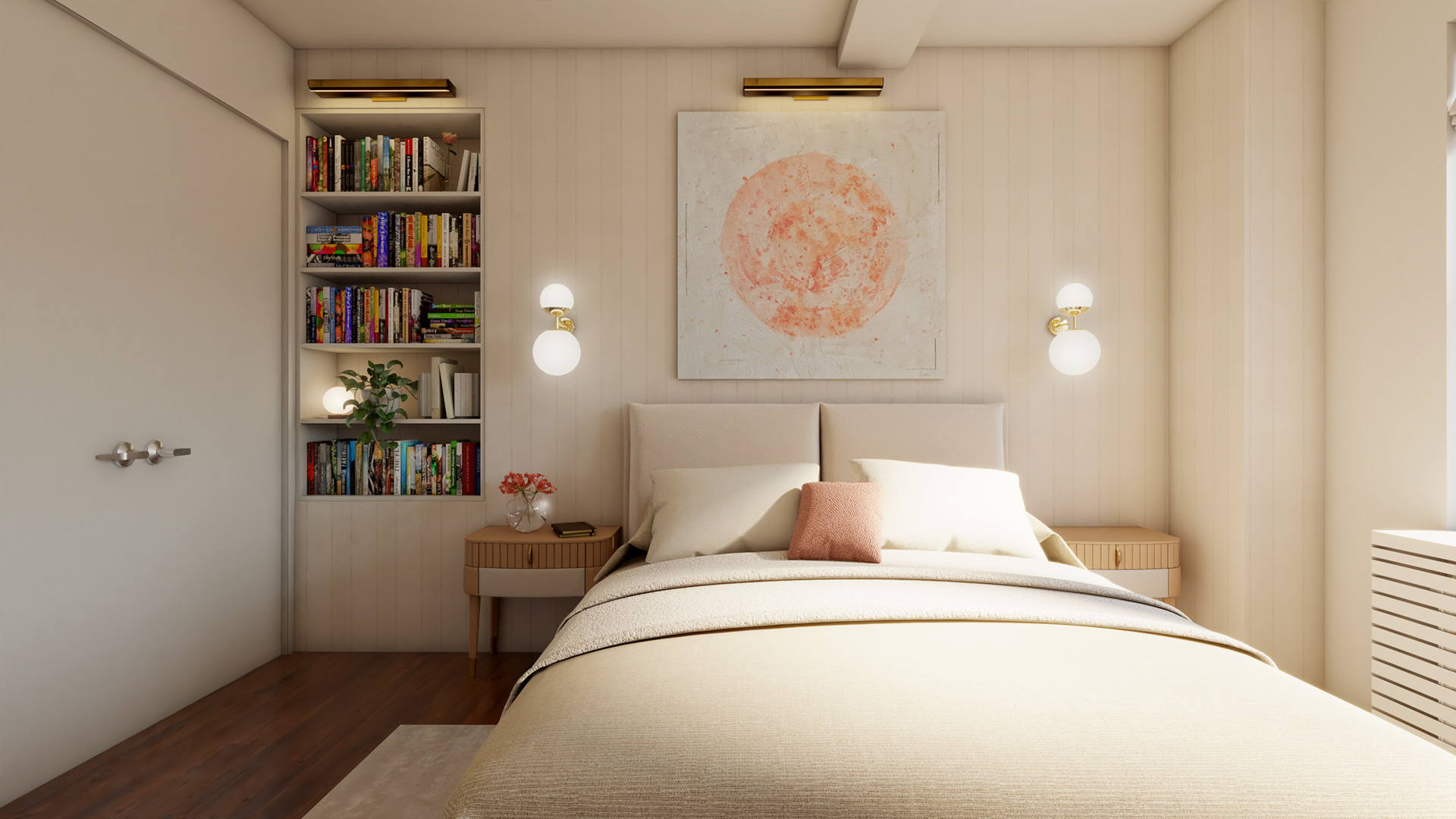 A modern minimalist bedroom with soft, feminine undertones, where clean lines meet warm textures. A palette of blush, ivory, and gold creates a soothing harmony, while sculptural seating, rounded lighting, and layered textiles add depth and balance. The design highlights subtle geometry and tonal contrast, resulting in a tranquil yet sophisticated retreat.