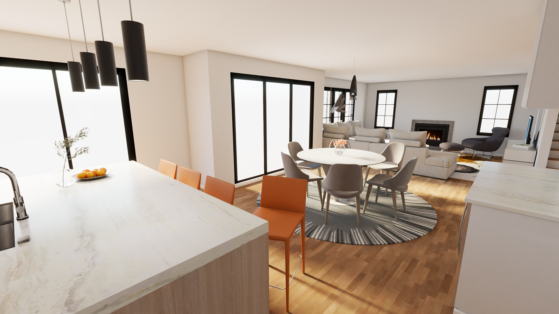 A contemporary open-concept residence defined by clean lines, layered neutrals, and vibrant accents. The kitchen features minimalist cabinetry and marble surfaces, anchored by bold orange stools that bring warmth and contrast. In the dining area, a sculptural pendant and graphic rug frame the round table, while the living space balances oversized seating with organic textures and soft natural light for a cohesive, modern flow.