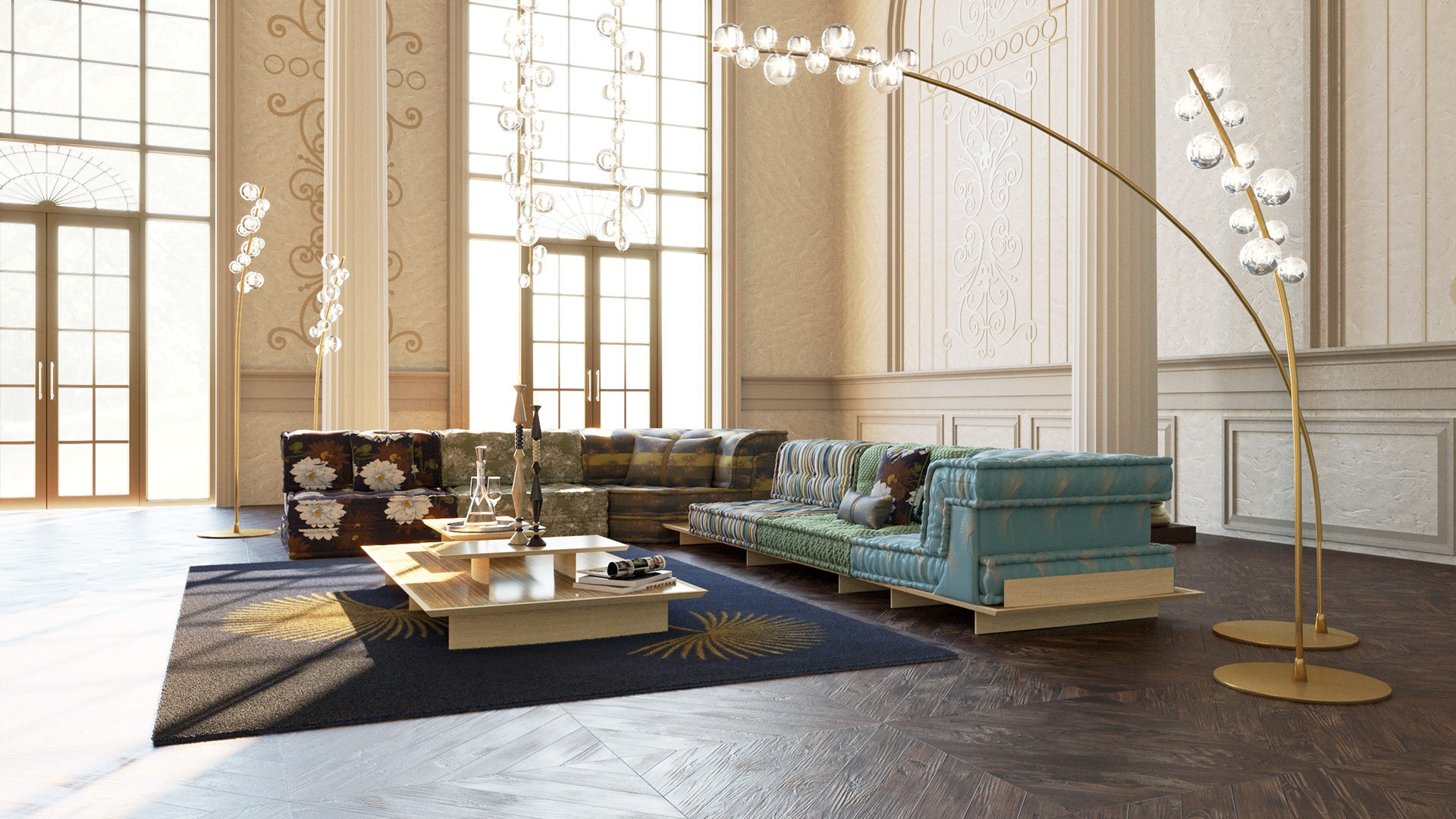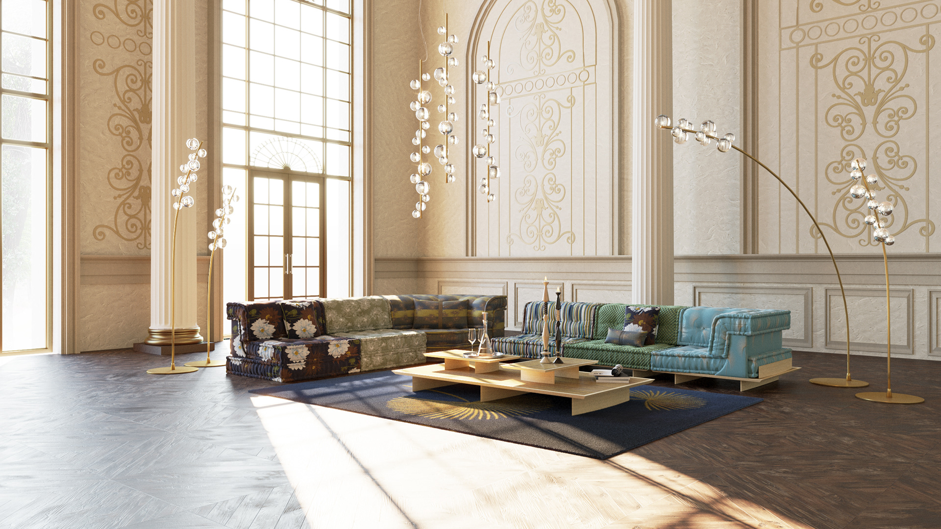 An eclectic lounge staged within a grand architectural setting, where bold pattern and color define the iconic Mah Jong sofa upholstered in fabrics by Kenzo Takada. Contrasting florals, stripes, and solids in earthy greens, deep blues, and warm neutrals create rhythm and visual tension, while low modular forms emphasize horizontality against the soaring classical backdrop. Sculptural glass lighting and golden arcs add vertical balance, enhancing the dialogue between contemporary playfulness and historic grandeur.