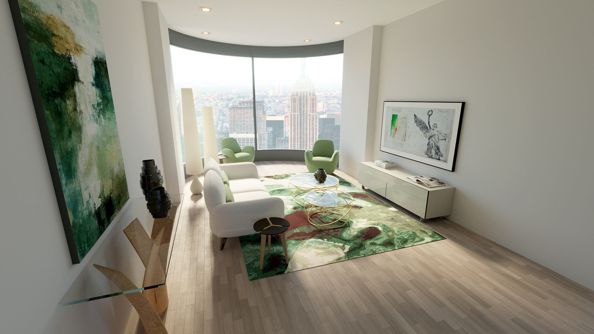 Modern minimalist design with artistic influences, this living room pairs clean-lined furniture with a soft green and white palette. An abstract painterly rug introduces bold color theory, while sculptural tables and curated artwork add a refined, gallery-like edge.