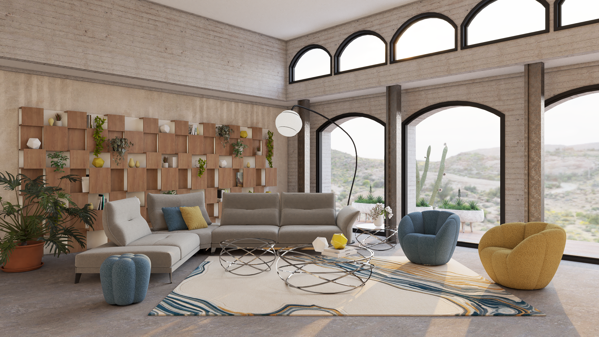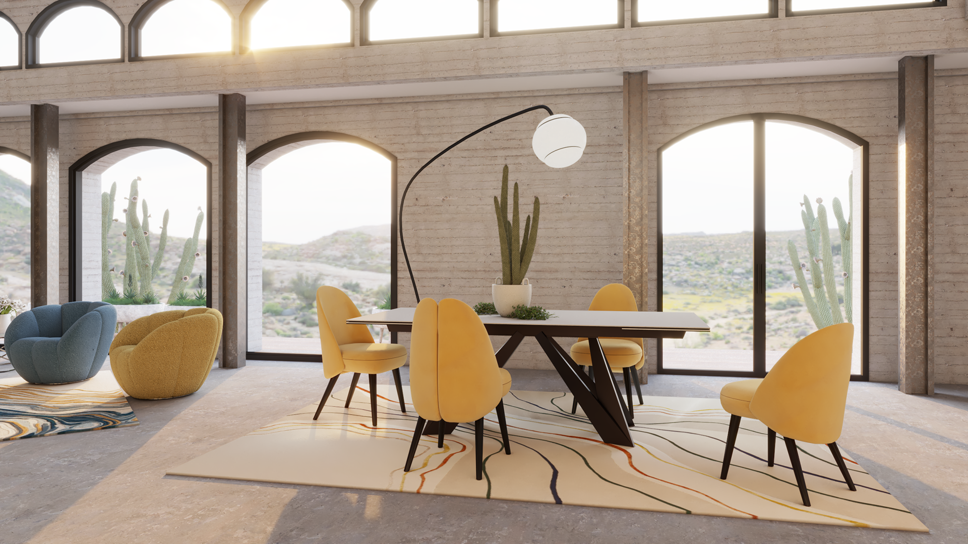 A modern desert residence with mid-century influences, blending raw textures and sculptural furniture with bold bursts of color. The living area pairs neutral-toned seating with vibrant blue and mustard armchairs, anchored by a marbled rug and geometric tables that echo organic movement. In the dining space, golden upholstered chairs surround a dynamic angular table, creating a striking balance of warmth, rhythm, and architectural precision.